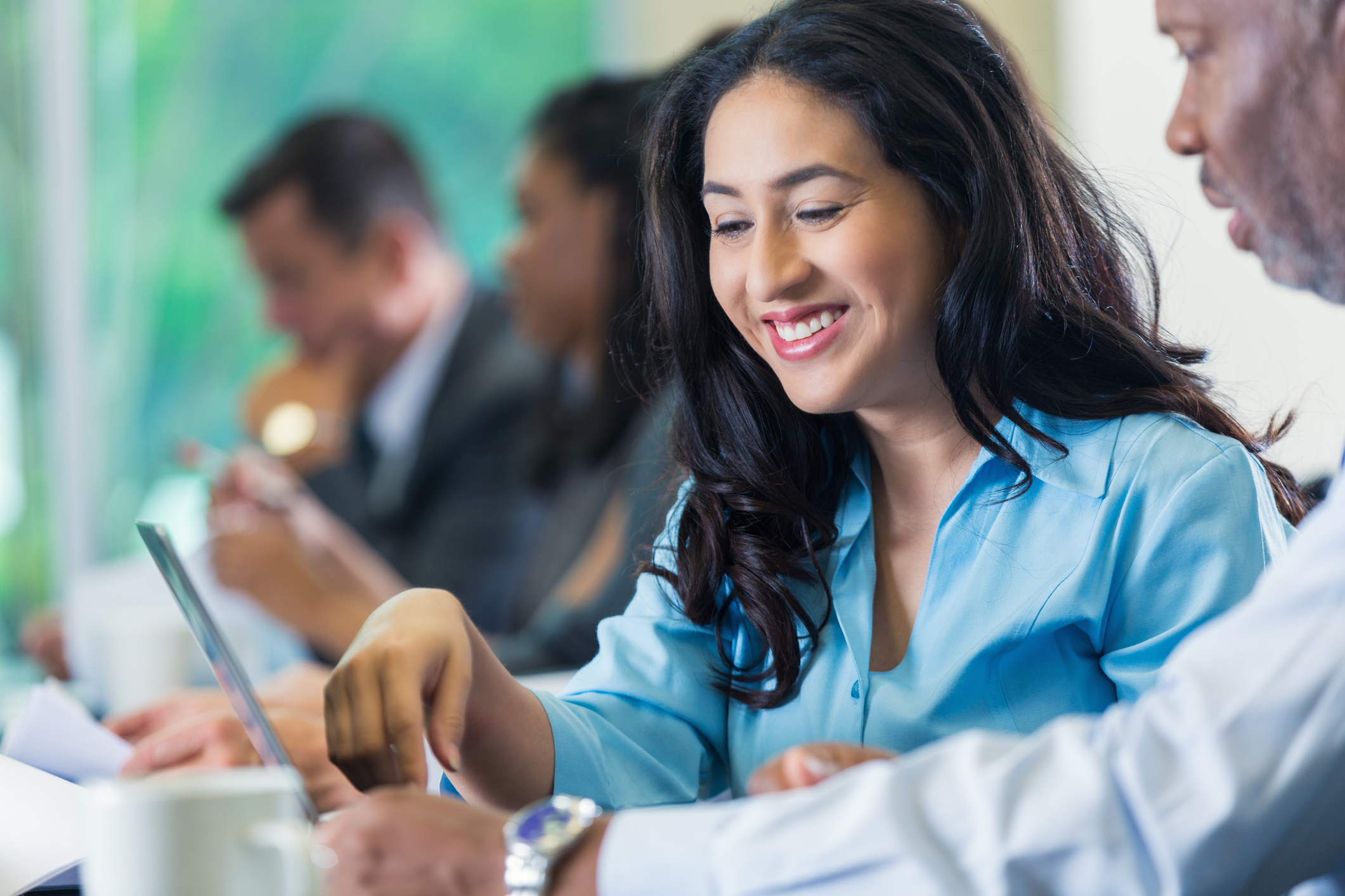 Mid adult Hispanic woman is sitting in lecture hall. She is taking notes on her laptop computer during a business class or seminar conference. She is talking to African American coworker. Diverse business professionals are sitting in a row behind her.